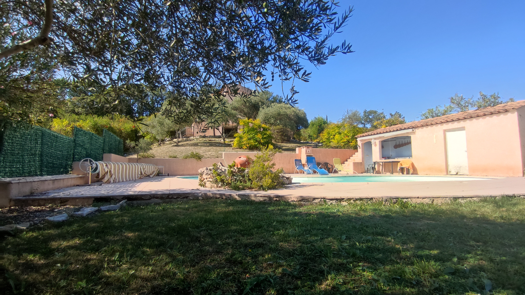 L'espace extérieur comprend un jardin arboré avec des fruitiers, oliviers et lauriers, ainsi qu'une piscine de 11,5X5,8m en PVC armé.